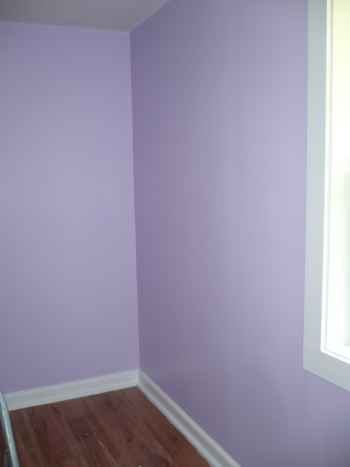 We ordered the bedding right away so we could have it in person to compare paint colors to. We didn't want to risk choosing a color and then the bedding showing up looking a different tone than the picture! We had a book of paint swatches with sticky note tabs marking our favorite colors. As soon as the bedding came in we sat down with it and our book and narrowed the colors down, eliminating the "too blue"s and "too pink"s. We settles on Lavender Lane by Pittsburgh paints.